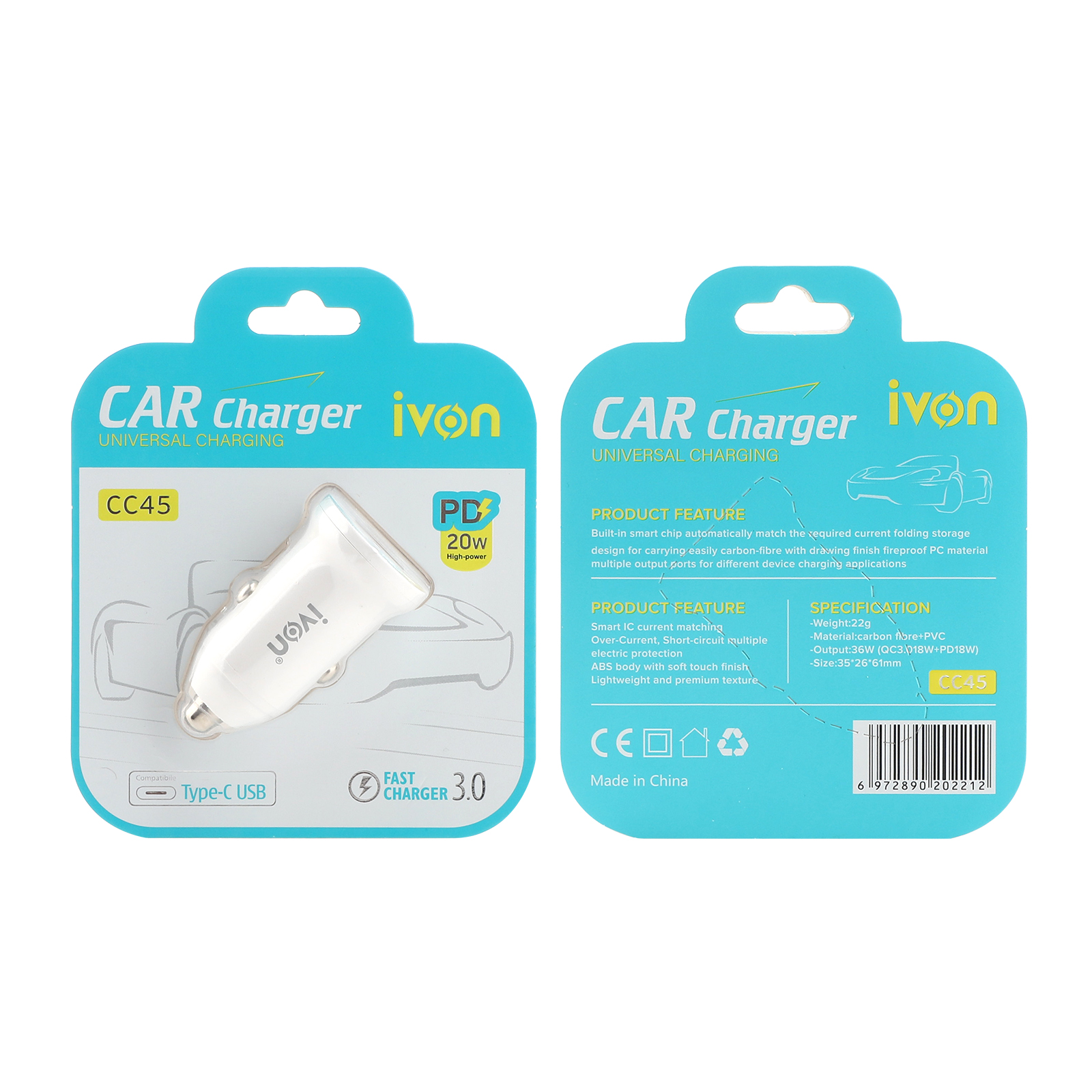 Ivon Dual port Car Charger : ( usb a + usb c ) PD+QC3.0 fast charge 25W for single using 5V 3.5 for dual cc40